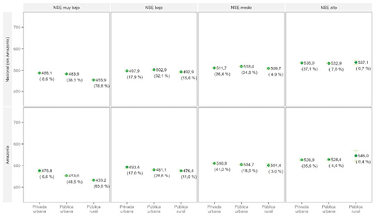 Estos estudiantes y sus escuelas presentan diferencias según su pertenencia a las regiones de la Amazonía o al resto del país a partir de diversas características. Dicha información se presenta en la Tabla 1, donde se encuentra organizada según su gestión (privada o pública), área (rural o urbana), característica (polidocente completo o multigrado/unidocente), y el nivel socioeconómico de los estudiantes.